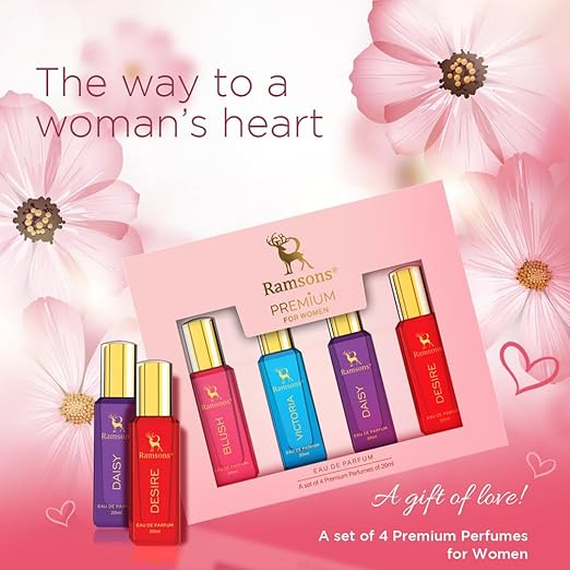 Discover the art of sophisticated fragrance with Ramsons Premium For Women Gift Set, a curated collection of four exquisite eau de parfums. Each 20 ML bottle showcases a distinct olfactory journey: Daisy's fresh florals, Desire's sensual allure, Blush's romantic warmth, and Victoria's timeless elegance. Formulated with premium ingredients, these long-lasting fragrances deliver enduring sophistication throughout your day. Perfect as a luxury gift or personal indulgence, this versatile set allows you to express different facets of your personality. Experience the refined craftsmanship of Ramsons' signature collection, where quality meets versatility in every spritz.